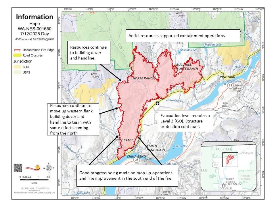The Hope Fire in northeastern Washington continues to burn, with fire officials reporting 6,526 acres scorched and 0 percent containment as of Sunday morning. A combination of steep terrain, hot and dry conditions, and shifting winds have made suppression efforts extremely challenging.